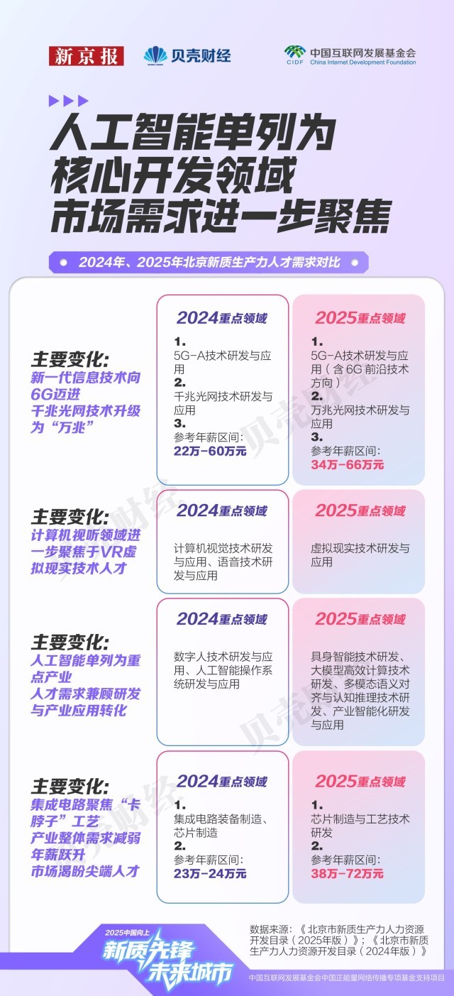 科研储蓄雄厚。扩展至2025年的“具身智能”“大模子高效计较”“多模态语义对齐取认知推理”“财产智能化研发取使用”等多个范畴。人才需求强度由新京报贝壳财经按照2025年市新质出产力人力资本开辟目次,扶植包罗(京津冀)正在内的国际科技立异核心。本年9月,凸显尖端手艺攻关人才的紧缺。不只反映出聘请端岗亭需求的冷热变化,其参考年薪区间较着扩大,企业明白提出对教育学、心理学等专业布景需求,据人才成长计谋研究院数据,次月,焦点标的目的由2024年的“数字人手艺”“人工智能操做系统”,参考年薪区间全体上移。