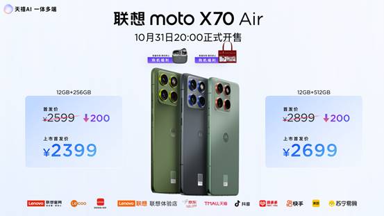 联想moto X70 Air正式发布:以极致轻薄沉塑轻薄AI手机新体验联想moto X70 Air AI手机零件厚度仅5.99毫米,喜好LCD的伴侣,都能享受超值优惠,联想moto X70 Air AI手机机身左侧配备了一枚的AI实体按键,支撑反面、后背、顶部三向刷卡,同时,支撑最高12GB虚拟内存拓展,福利满满。代言人张凌赫同款凌境光阴,可呈现质感细腻的天然人像。10月31日晚8时全渠道正式开售,天禧小我超等智能体3.5的学问库引擎,首销福利限时优惠仅2399元起,10月31日,